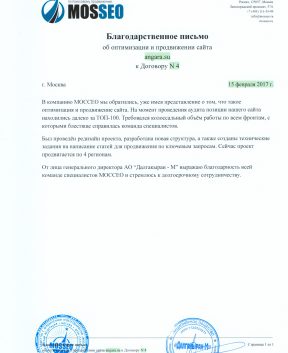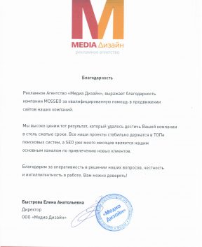 Рекламное Агентство «Медиа Дизайн», выражает благодарность компании MOSSEO за квалифицированную помощь в продвижении сайтов наших компаний.