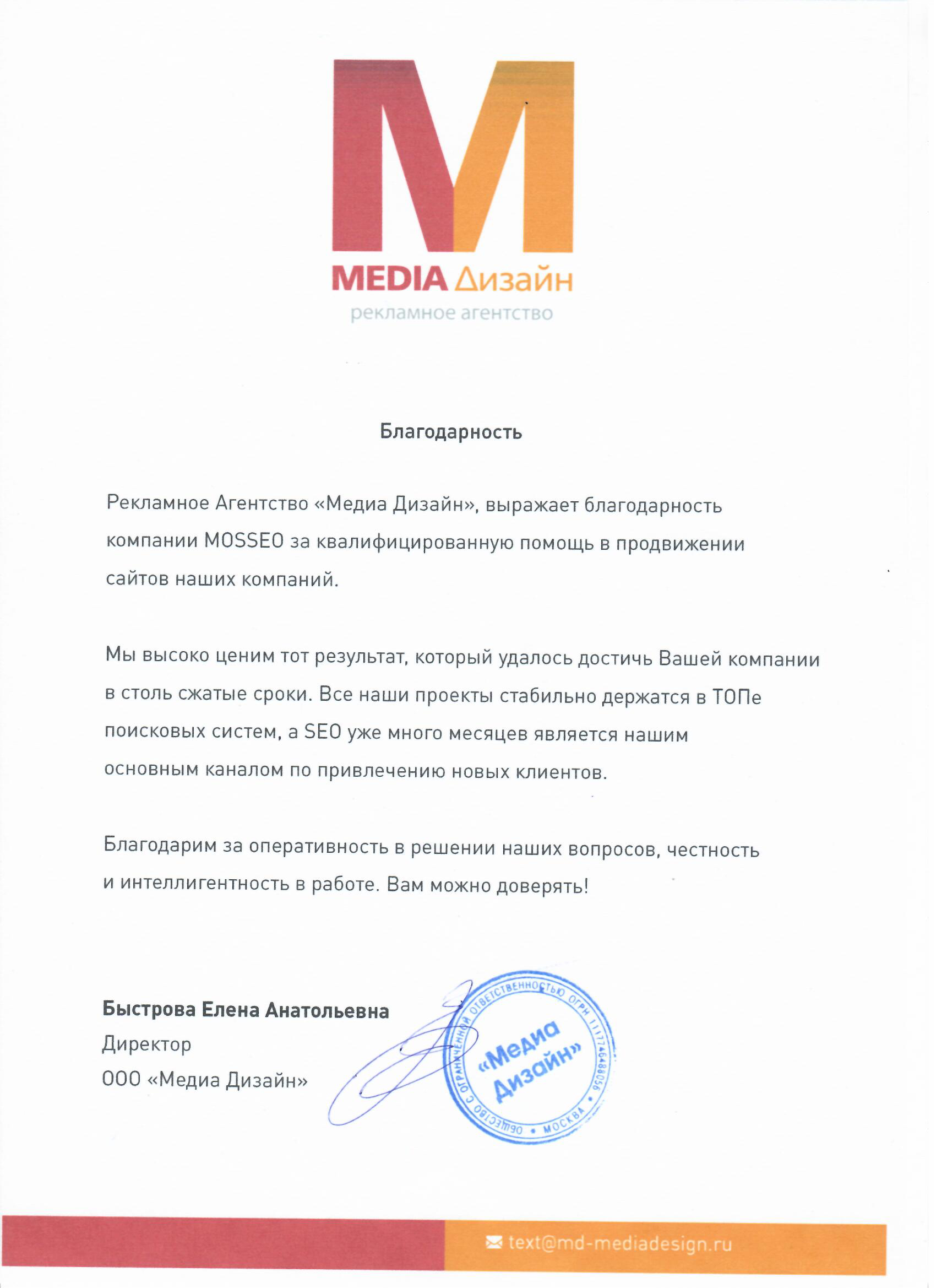 Благодарим за оперативность в решении наших вопросов, честность и интеллигентность в работе.